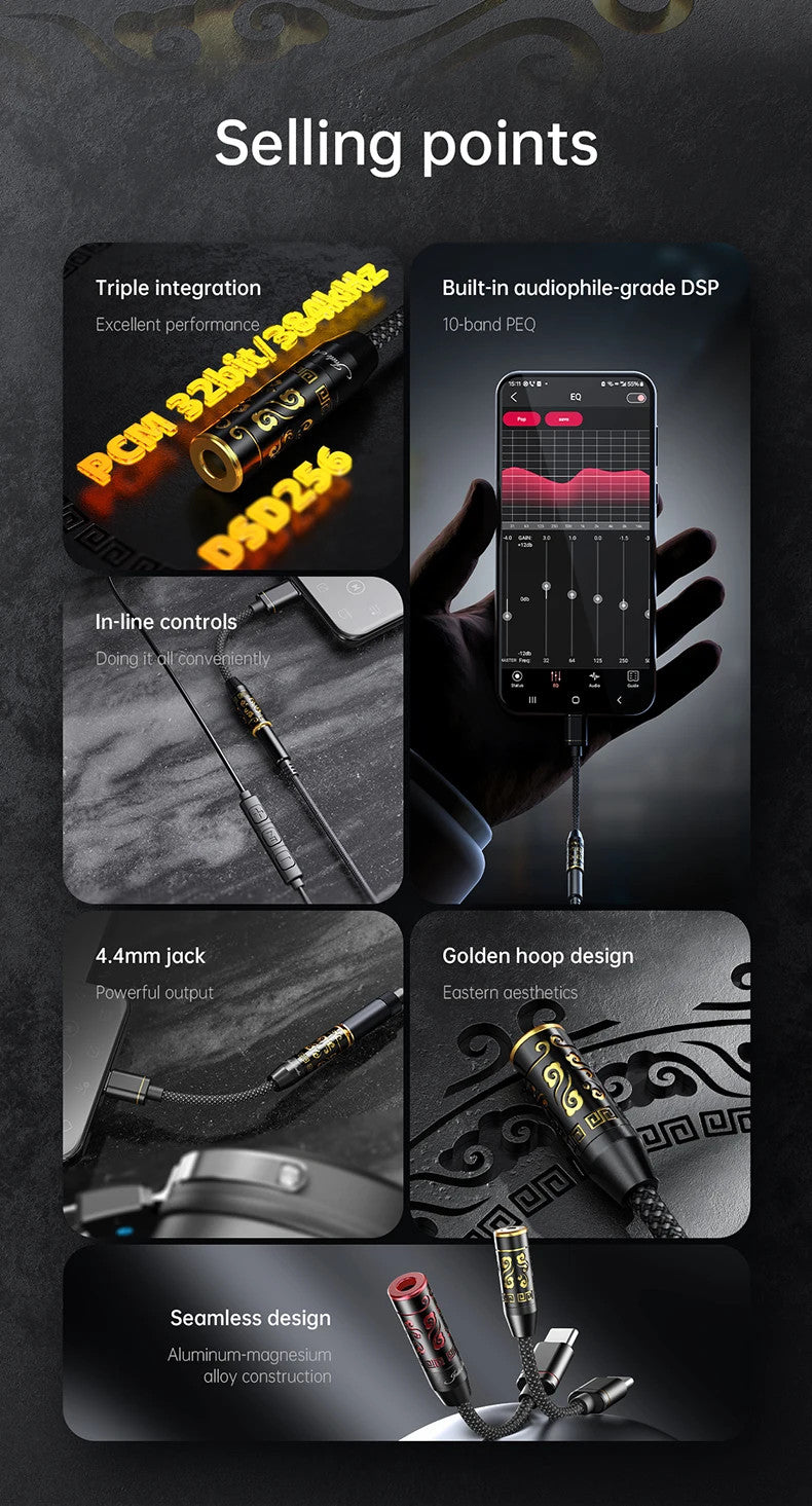 Audiophile-Grade DSP & 10-Band PEQ — Fine-tune filter type, frequency, gain, and Q in the FiiO Control App or web interface; save and share tunings via the cloud.